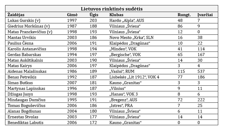 Trenerio Savukyno sąraše buvo kelios priverstinės permainos. Į rinktinę dėl asmeninių priežasčių negalėjo atvykti vienas iš rezultatyviausių Rumunijos lygos rankininkų, „Buzău“ klube žaidžiantis Gabrielius Virbauskas, traumas patyrė Mykolas Lapiniauskas iš Vilniaus „Šviesos“ ir Tomas Drakšas iš Klaipėdos „Dragūno“.