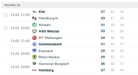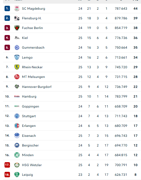 Pirmauja: „Magdeburg“ – 44, „Flensburg“ – 39, „Füchse“ – 38, „Kiel“ – 36, „Gummersbach“ – 35, „Lemgo“ – 34, … „Stuttgart“ – 18, … „Bergische“ – 12, „Minden“ – 12.