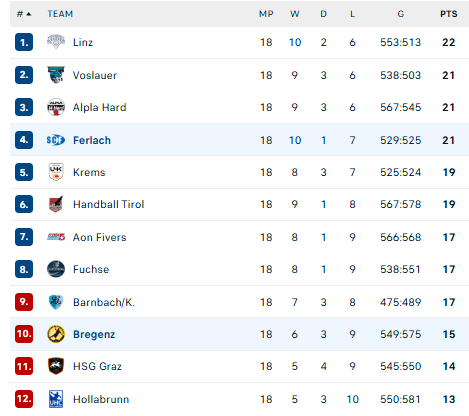 Pirmauja: „Linz“ – 22, „Vöslau“ – 21, „Alpla“ – 21, „Ferlach“ – 21, … „Bregenz“ – 15.