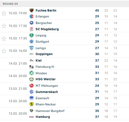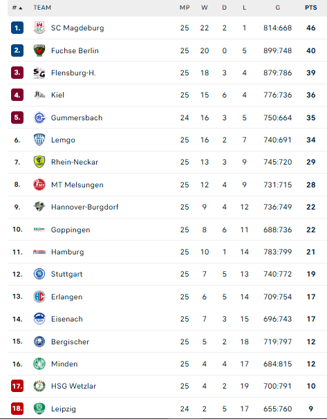 Pirmauja: „Magdeburg“ – 46, „Füchse“ – 40, „Flensburg“ – 39, „Kiel“ – 36, „Gummersbach“ – 35, „Lemgo“ – 34, … „Stuttgart“ – 19, … „Bergische“ – 12, „Minden“ – 12.