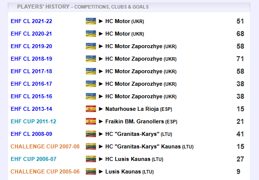 Malašinsko sezonai Europos turnyruose: