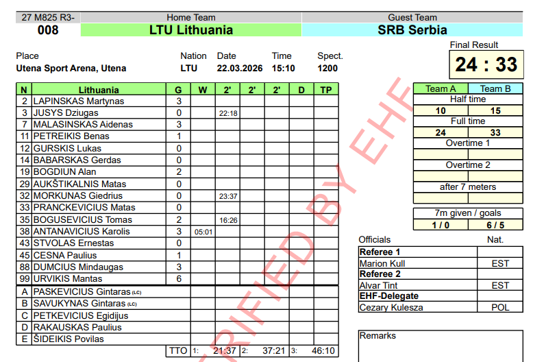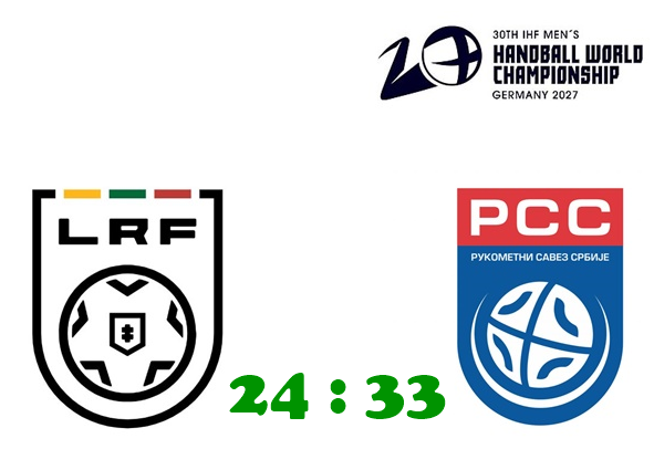 Lietuva – Serbija 24:33 (10:15). Utena. 1200 žiūrovų. Pirmosios rungtynės 25:42.