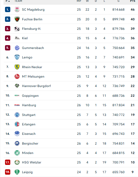 Pirmauja: „Magdeburg“ – 46, „Füchse“ – 40, „Flensburg“ – 39, „Kiel“ – 36, „Gummersbach“ – 35, „Lemgo“ – 34, … „Stuttgart“ – 19, … „Bergische“ – 14, „Minden“ – 12.