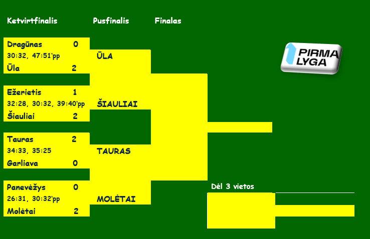 Praėjusių metų pirmosios lygos čempionai „Šiauliai“ laimėjo ketvirtfinalio seriją 2:1 ir pateko į finalo ketvertą. Kitų trijų ketvirtfinalio serijų nugalėtojai paaiškėjo per dvejas rungtynes. Varėnos „Ūlos“ dubleriai įveikė Klaipėdos „Dragūno“ dublerius, „Molėtai“ – „Panevėžį“, Vilniaus „Tauras“ – „Garliavą“.