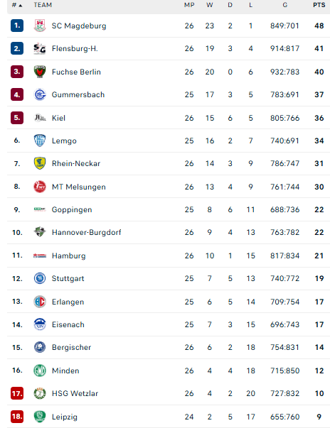 Pirmauja: „Magdeburg“ – 48, „Flensburg“ – 41, „Füchse“ – 40, „Gummersbach“ – 37, „Kiel“ – 36, „Lemgo“ – 34, … „Stuttgart“ – 19, … „Bergische“ – 14, „Minden“ – 12.