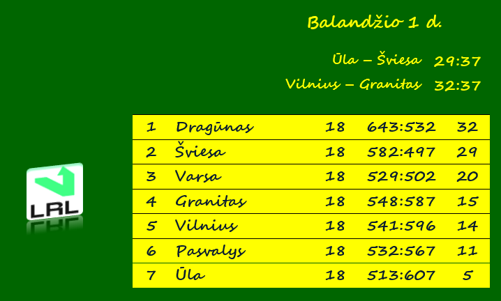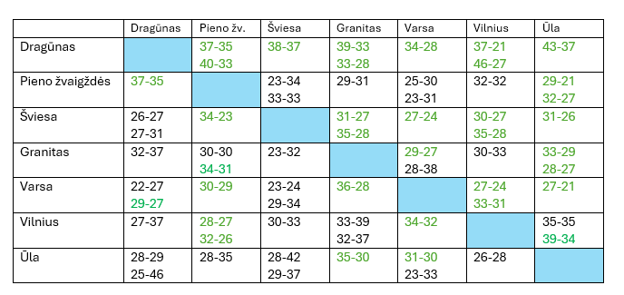 | Įmesti įvarčiai | 37 – Šviesa, Granitas | 46 – Dragūnas (su Ūla, su Vilniumi) |