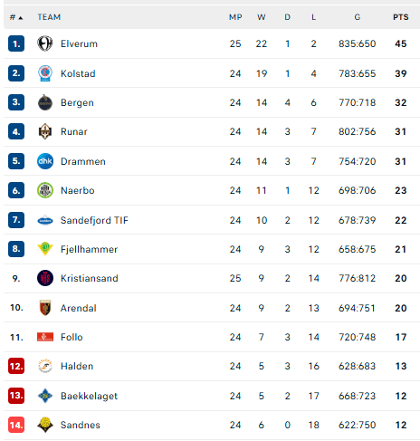 Pirmauja: „Elverum“ – 45, „Kolstad“ – 39, „Bergen“ – 32, „Runar“ – 31, „Drammen“ – 31, … „Kristiansand“ – 20.