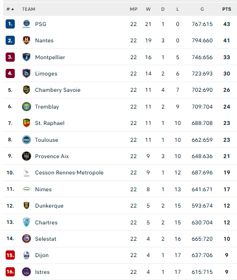 Pirmauja: PSG – 43, „Nantes“ – 41, „Montpellier“ – 33, „Limoges“ – 30, „Chambery“ – 26, „Tremblay“ – 24.