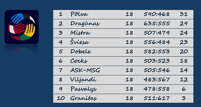 Estijos lygoje vaizdas buvo panašus. Reguliariojo sezono nugalėtoja tapo nė vieno pralaimėjimo nepatyrusi „Serviti“ (39 tšk.), o antrąją vietą taip pat užtikrintai užėmė „Mistra“ (27 tšk.). Trečiojoje vietoje likęs „Viljandi“ klubas nuo Rasiku komandos atsiliko 6 taškais.