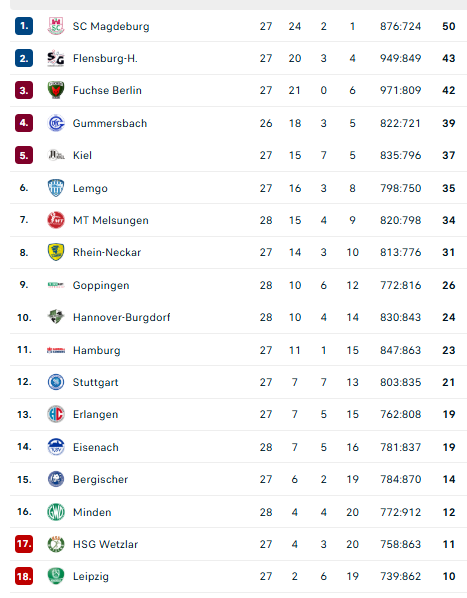 Pirmauja: „Magdeburg“ – 50, „Flensburg“ – 43, „Füchse“ – 42, „Gummersbach“ – 39, „Kiel“ – 37, „Lemgo“ – 35, „Melsungen“ – 34.