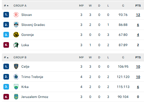 Lentelė: „Celje“ – 10, „Trimo“ – 10, „Krka“ – 6, „Jeruzalem“ – 0.