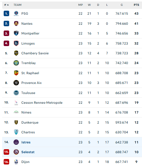Pirmauja: PSG – 43, „Nantes“ – 41, „Montpellier“ – 33, „Limoges“ – 32, … „Istres“ – 11.