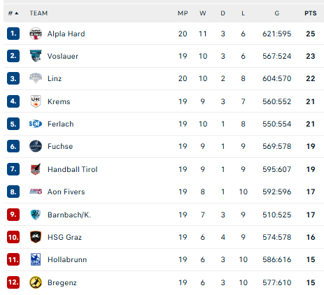 Pirmauja: „Alpla“ – 25, „Vöslau“ – 23, „Linz“ – 22, … „Bregenz“ – 15.