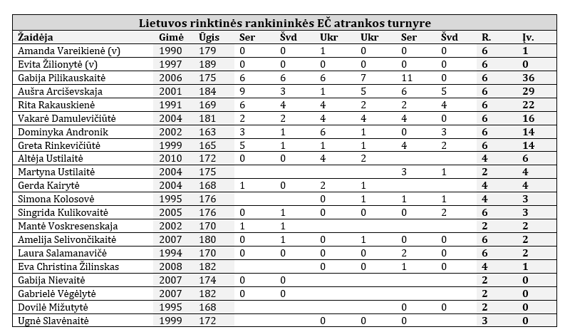 Lietuvos rinktinėje rezultatyviausiai žaidė Gabija Pilikauskaitė, per šešerias rungtynes įmetusi 36 įvarčius. 29 įvarčius pelnė Aušra Arciševskaja, 22 – Rita Rakauskienė, 16 – Vakarė Damulevičiūtė, po 14 – Dominyka Andronik ir Greta Rinkevičiūtė.