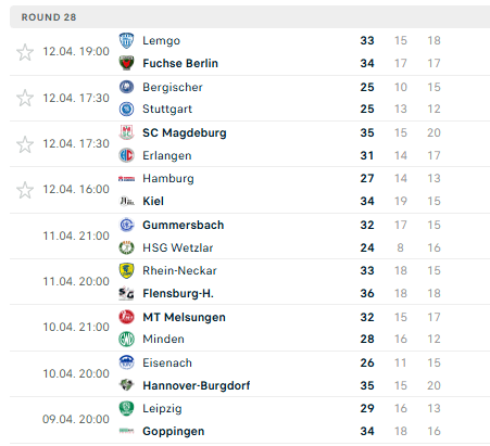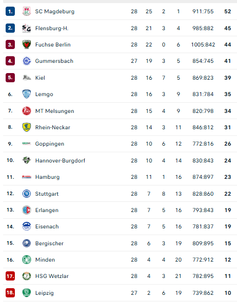 Pirmauja: „Magdeburg“ – 52, „Flensburg“ – 45, „Füchse“ – 44, „Gummersbach“ – 41, „Kiel“ – 39, „Lemgo“ – 35, … „Stuttgart“ – 22, … „Bergische“ – 15, „Minden“ – 12.
