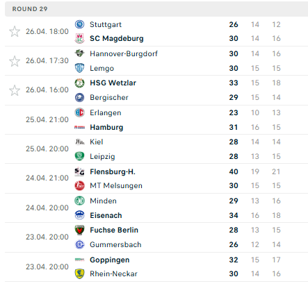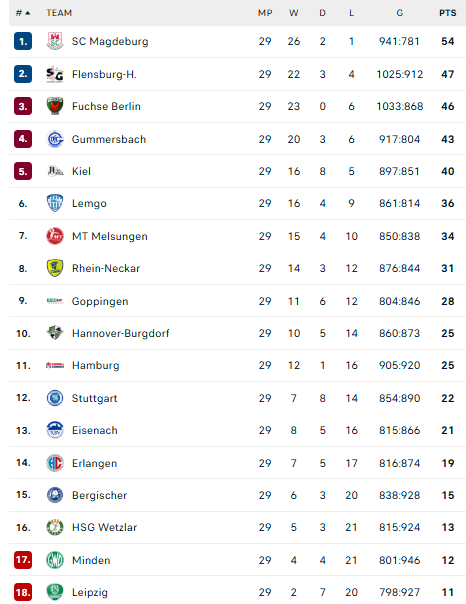 Pirmauja: „Magdeburg“ – 54, „Flensburg“ – 47, „Füchse“ – 46, „Gummersbach“ – 43, „Kiel“ – 40, „Lemgo“ – 36, … „Stuttgart“ – 22, … „Bergische“ – 15, … „Minden“ – 12.