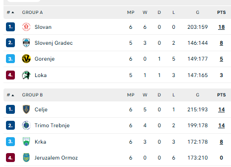 Lentelė: „Celje“ – 14, „Trimo“ – 14, „Krka“ – 8, „Jeruzalem“ – 0.